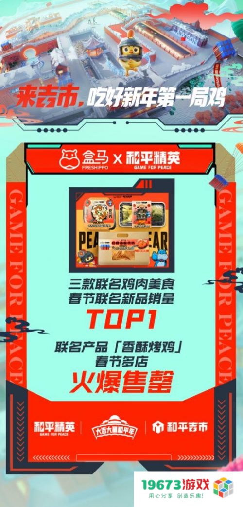随处可见的蓝色空投箱,琳琅满目的“吃鸡”年货……兔年春节之际,和平吉市热闹开张,以线下便利店、线下商超等年货场景为接入点,携手罗森、盒马两大品牌,创造出「来吉市,吃好新年第一局鸡」的文化氛围,为众多玩家带来了一场情绪与产品深度融合的跨界“吃鸡”体验。