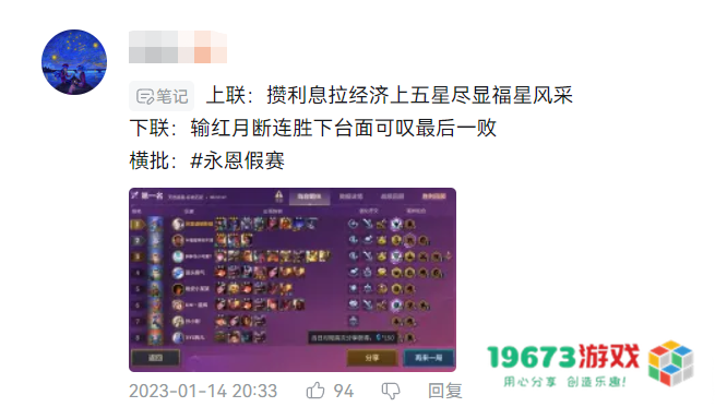 更有一些小机灵鬼儿,趁着别人都在玩福星走连败,掏出一套强力阵容,偷摸着打出19连胜上分的,还真是蛮会整活的。