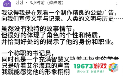 先说艾尔海森的角色PV。原神这次在艾尔海森的角色PV上做了一些创新,相比以前角色PV满满的故事性,艾尔海森的由于有些深奥,加上“书籍”、“学院”等元素出现较多,背景音乐也非常柔和,具有“学术劝导”的味儿,所以被很多玩家戏称为“须弥公益广告”、“读书公益广告”、“须弥招生宣传片”。
