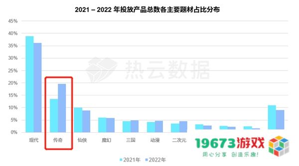 品类层面,角色扮演、休闲益智为代表的头部买量优势依旧明显。今年中重度游戏在新游买量的表现有所突破。其中,动作类游戏跃升幅度最大并成为了 2022 年手游类型新增率第一,买量竞争热度加剧。题材买量层面,现代题材投放热度最高、传奇题材占比提升较快。