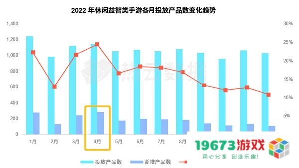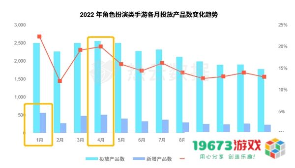 角色扮演类游戏 4 月投放产品数最多,春节前夕为新品买量高峰;SLG类4、5 月投放总量及新增率表现突出,Q4 买量新品数大幅下滑; 休闲益智类游戏,月度投放产品数较为均衡,4月新游投放数量最多。