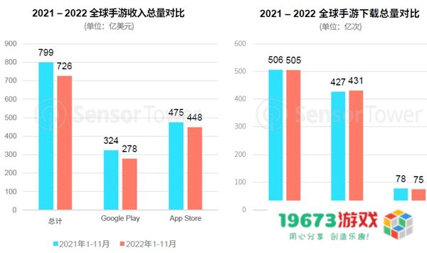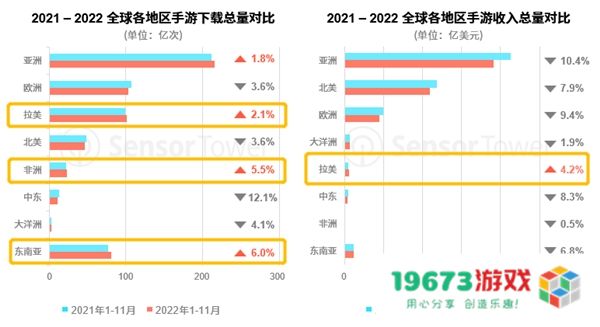 2022年全球移动游戏市场呈“总体下行,局部稳增”的态势。全球手游市场收入总量同比下滑,是自新冠疫情爆发以来收入表现首次出现明显下降的一年,大部分手游品类以及区域市场均出现负增长。在下载量层面,2022年总体下载量基本与去年保持持平,尽管欧美成熟市场出现不同程度负增长,但新兴市场例如拉美、东南亚和非洲却展示出乐观的增长趋势。