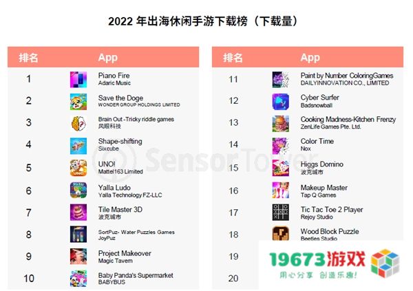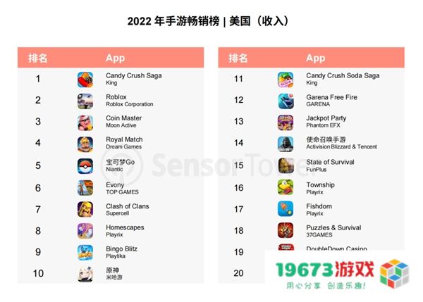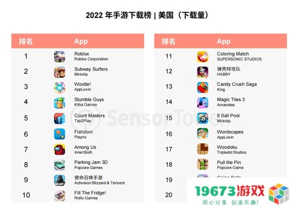 具体而言,以美国市场为例,该国的休闲类手游买量地位仍然牢固排名首位,且在单品的下载量以及收入的表现上依旧突出。 收入层面,经典三消手游《Candy Crush Saga》依靠频繁的关卡更新维持着稳定的用户活跃与营收,并在 2022 年超过《Roblox》重登美国畅销榜榜首。而在 2022 年美国手游下载榜 Top 20 中,共 7 款为超休闲品类,可见该品类巨大的市场潜力。