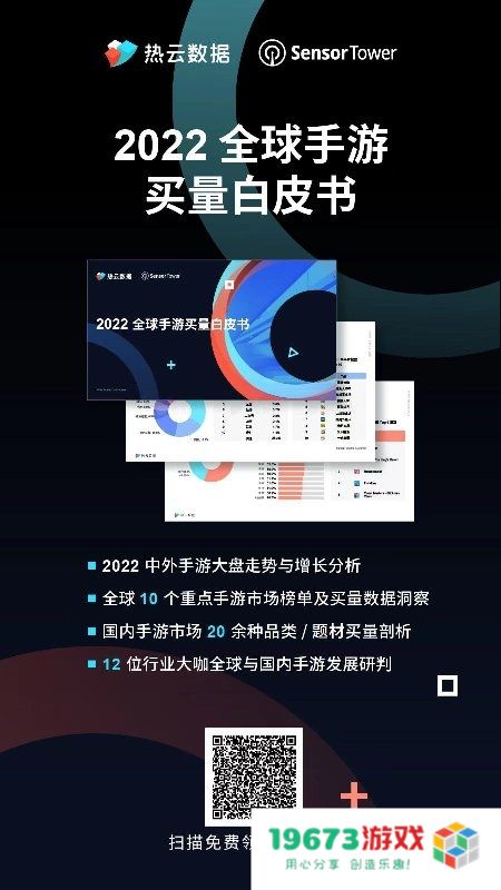 为帮助广大手游厂商更好观察全球移动游戏发展现状及做好2023趋势研读,汇量科技旗下热云数据特别携手SensorTower重磅发布《2022全球手游买量白皮书》,深入剖析全球手游大盘及10个主要买量市场变化趋势,解析重点游戏品类题材买量特征,梳理全球手游市场关键榜单,并邀请多位行业大咖从不同视角对全球与国内手游发展进行研判,帮助游戏行业从业者全方位了解2022年手游整体买量市场趋势,洞察买量增长新方向。