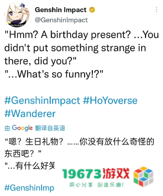 同时,原神给流浪者庆生的官图也暗含了一些细节。比如虽然玩家们没有办法给流浪者回礼,但在官方的文案中,旅行者是给流浪者礼物回赠了的,所以这也算是一个小彩蛋了。外国玩家甚至对流浪者给出了“他像个公主”的奇妙评价,可见有很多人对流浪者还是十分喜爱的。