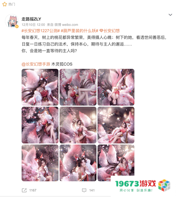 首发当日,全平台公布了代言人宋轶唐风TVC大片《我在长安等你》,仅靠这条内容,就冲上了微博热搜榜第15名,话题“葫芦里装的什么妖”引发热烈讨论,相关话题总阅读量突破6亿,相关微博转赞评达到4万。众多画师、Coser纷纷下场,发布专业作品吸引了众人眼光,其中画画的慕白、眠狼、清风澈、晓泊21等人气画师基于游戏内容创作了许多同人美术作品,而矮乐多Aliga、走路摇ZLY 、w百合欧皇子w等知名coser也发布了游戏角色的cos装扮,塑造了妖媚的九尾狐、可爱的花楹、活泼的小书灵等形象,称作是“漫撕女”也不为过。与此同时,长安幻想手游官号下场,多番互动,协助游戏斩获微博游戏榜第一的成绩。