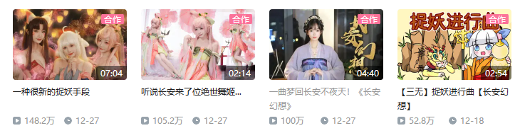 在二次元为主的b站,首发当天12点,游戏联合多位大量级UP主同时发力,公布了音乐、舞蹈、特效大片、武术、手工等多个领域的作品,全方位占据B站用户的视线。由银临制作、咻咻满演唱的原创主题曲《长安幻想》,以及由舞蹈区头部UP主紫颜-小仙紫原创的主题曲舞蹈视频,发布后立即登上了热门推荐并持续霸榜2天,截至发稿前,紫颜的舞蹈视频已经冲上了热门榜榜首的位置,播放量破百万。游戏联合“特效小哥”发布的真人实景特效大片《一种很新的捉妖手段》,在上线后持续发力,于上线第二天冲上热门榜单,斩获百万播放。此外,被戏称为“国家队”的音乐区UP主柳青瑶本尊发布了原创琵琶曲《幻想长安》,专业武术UP主俩大叔的功夫梦发布了COS捉妖视频,从音乐、武术等多维度进行了基于游戏内容的二创,为游戏的国风内涵添砖加瓦,全方位释放游戏亮点内容。