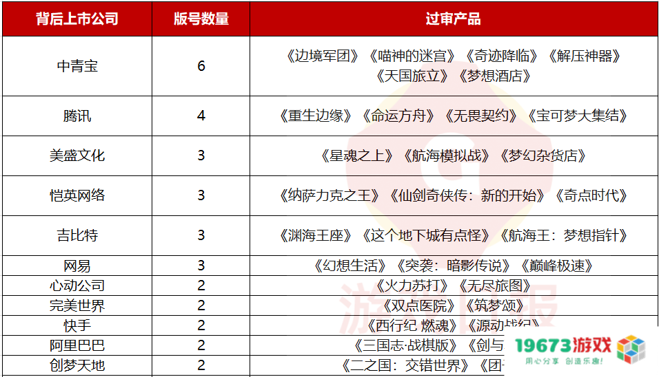日前,版署公布了12月版号审批情况,包括84个国产游戏和44个进口游戏过审。19673游戏网整理了其中对应的上市公司情况(仅参考对应公司背后母公司/投资公司是否是上市企业),最终发现中青宝过审版号最多,总计是6款;其次是腾讯4款;美盛文化、恺英网络、网易和吉比特分别有3款;心动公司、完美世界、快手、阿里巴巴和创梦天地分别有2款;世纪华通、名臣健康、浙数文化等15家上市公司拿到1个版号。
