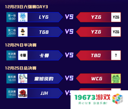 TGB首战告捷,以碾压的战绩开门红鼓舞士气;但在12月23日,依旧有一场对决等着他们,能否保持势头,杀入决赛,现在还未知。六强赛的队伍,除YZG外均已进行过比赛。卡曼队一胜一负的战绩,能否晋级仍在观望中。23日的直播中充满了惊喜与未知,哪些队伍能突出重围,哪些队伍将抱憾离场,六强赛最后一日对决不容错过。