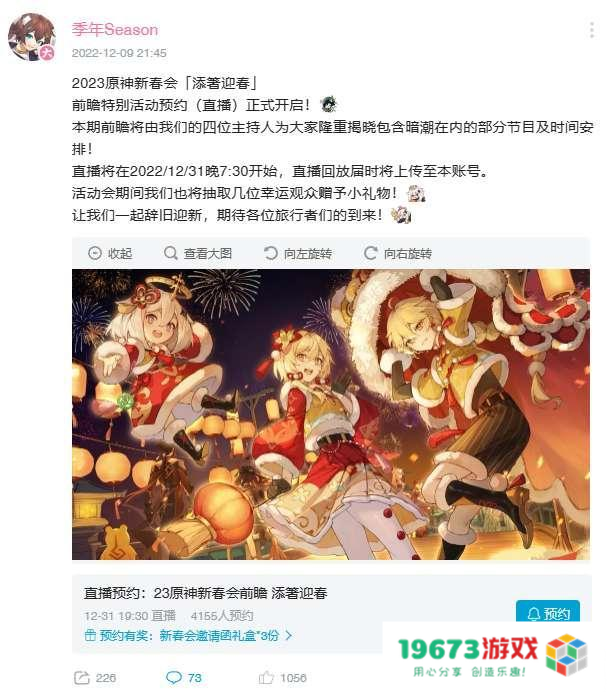 正如老外们说的那样,中国原神社区搞出来的东西属实配得上“脑洞大开”。就不说各种离谱的二创,二创圈最出名的原神生日会和新春晚会就是各种高质量二创神仙打架,用晚会、庆典的形式来给原神“过节”。前段时间的原神二周年生日会就诞生了许多神作,譬如《如果突然想起我》。这次的原神2023新春晚会应该也不差,感兴趣的大家伙可以到时候关注一下!