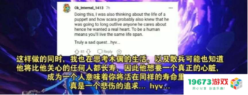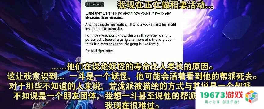 欧美玩家则在讨论前段时间试胆大会的秋津羽戏PV。PV中讲述了人类武士和妖怪的故事,颇有种“不可结缘徒增伤悲”的遗憾感,老外们也能从原神精良的制作中感受到这段故事并且共情。然而老外们也很擅长自己找刀子吃,比如有玩家提出“荒泷一斗是鬼的话,会不会活着见到荒泷派成员老去”。好家伙,这一看就是个成熟的原神玩家,都会自己刀自己了,泪目。