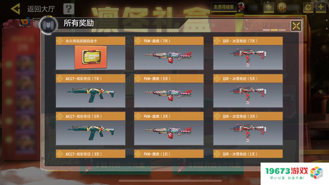 作为今年最后一次大型活动,本次更新后的凛冬礼盒给出道具也非常不错。本次礼盒将由三把凛冬系列传说武器登场,活动期间,只要玩家登陆过道聚城、每日分享过该活动,都能获得活动消耗道具“糖果”。每消耗80糖果就能进行一次抽奖,随机获得一个道具奖励。
