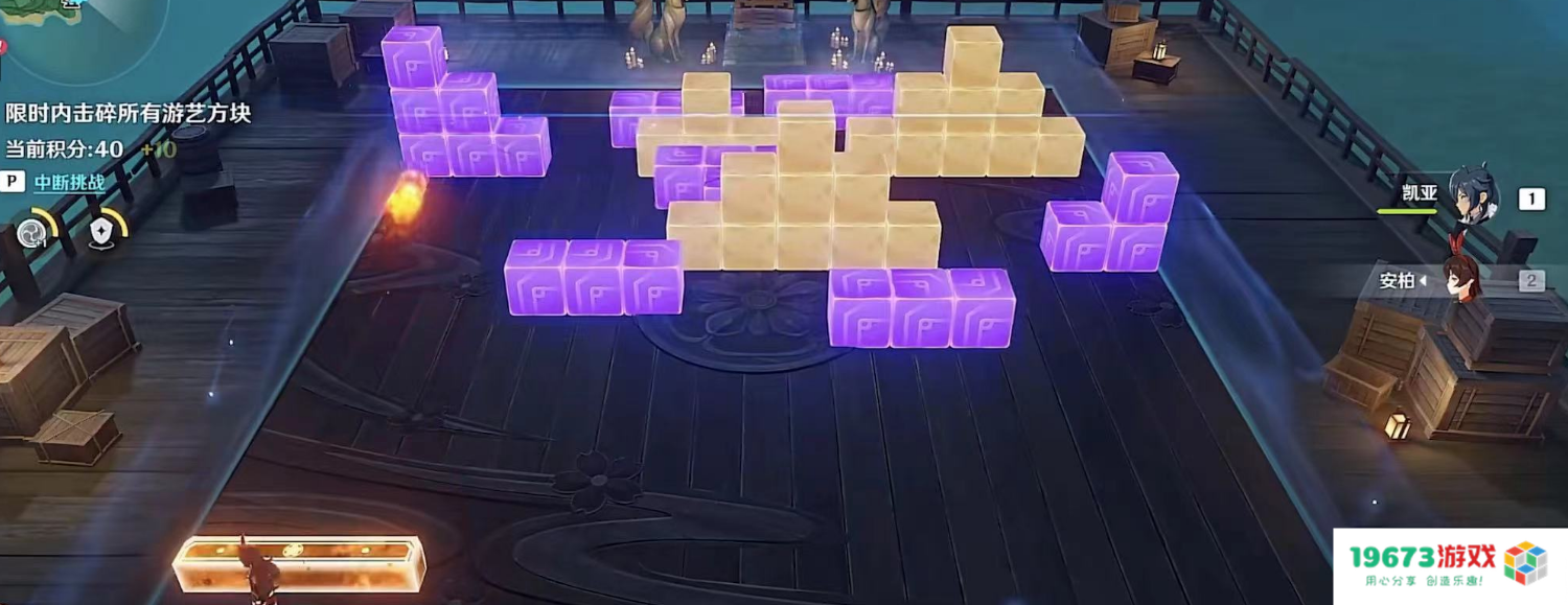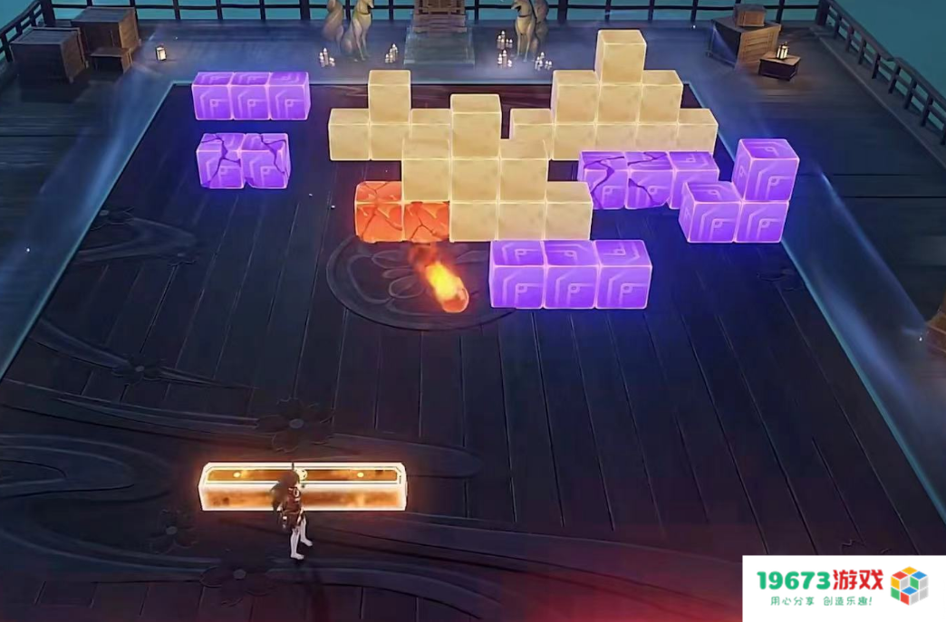 除开可圈可点的剧情表现之外,试胆大会的玩法也很有趣。玩家需要通过用角色操控形状、元素各异的方块来完成通关,不同角色还会为方块进行不同的元素附着。就是说能把这么简单的小游戏做出原神的特色,制作组也是非常有创意。