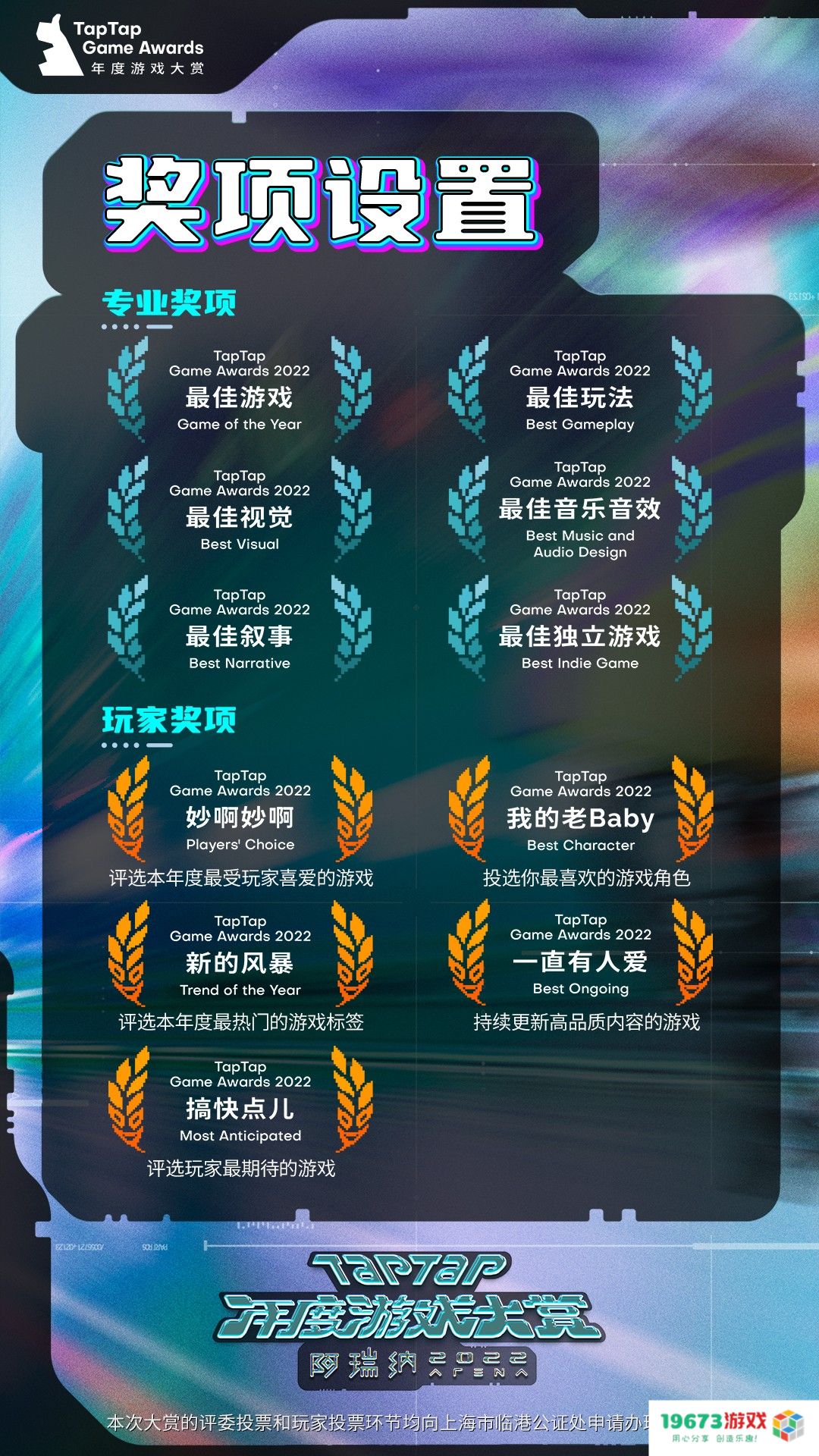 本届大赏共计评选11个奖项,分为专业评选与玩家奖项两大类。值得一提的是,今年的玩家奖项将在去年的基础上新增3个,总数量达到5个,几乎与专业奖项分庭抗礼。这些奖项的入围游戏以及最终冠军都将由玩家投票决定。游戏好不好玩,只有玩家知道,所以这一票理应由玩家们自己来投出。为保证权威性,专业奖项获奖结果完全由评委投票选出。而玩家奖项则全部由玩家投票,投票通道于2022年12月16日至26日开放,全部评选过程由“上海市临港公证处”监督并公证。