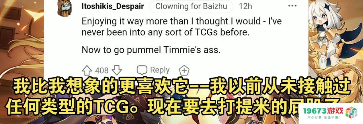 在进入猫尾酒馆正式体验过七圣召唤后,老外们也和国内玩家一样,被原神七圣召唤的精妙对局设计、玩法以吸引,纷纷给出好评。譬如从未接触过卡牌玩法的玩家直接“上瘾”,不仅玩了一晚上,还爱上了在大世界和NPC进行对决的玩法,并且第一时间赶去“迫害提米”;还有老外表示NPC似乎对自己“有所保留”,觉得NPC还是放水了。嗯,看得出来,这位玩家应该是会填“非常简单”的人。