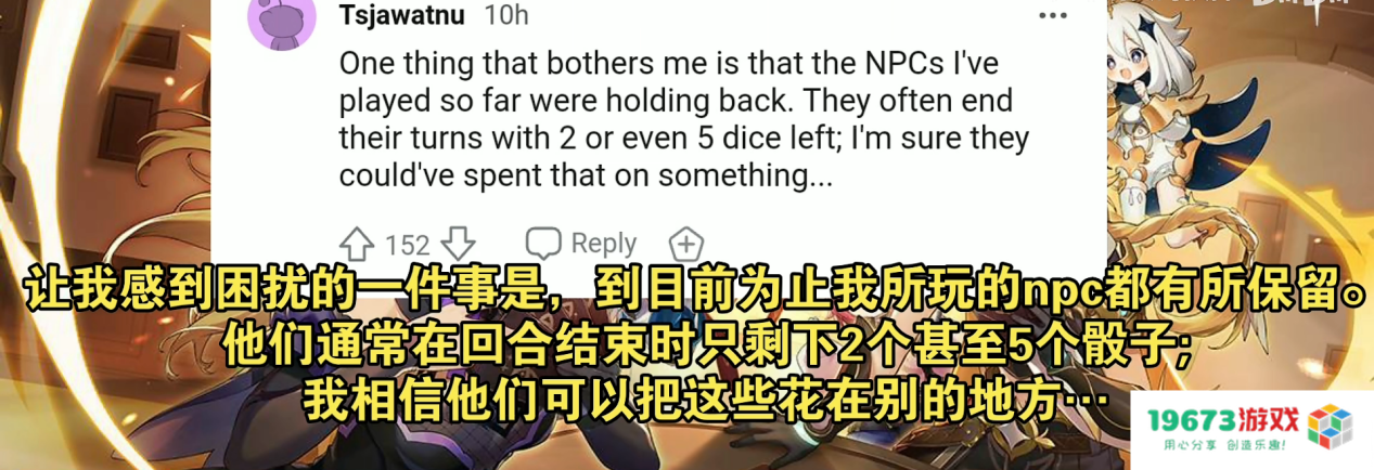 不过加入了扔骰子和元素反应的卡牌玩法对部分玩家来说还是有些生疏,所以也有老外在帮助还没能很好理解规则的小伙伴讲解,并提出配队、技能的建议。甚至还有老外转载了国内玩家的迪卢克核爆的视频,把迪卢克高达42的伤害分享在社交平台,可见七圣召唤在外国玩家群体中有多受欢迎了。
