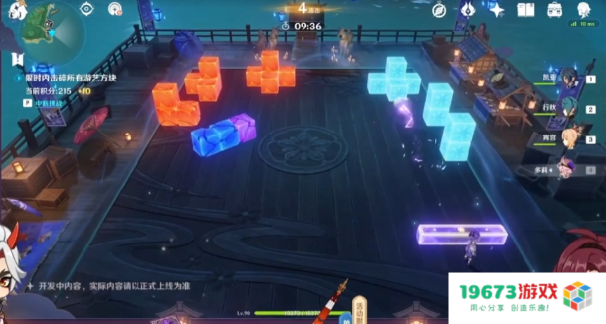 原神在3.3版本安排的活动也很独特,规模最大的就是贯穿3.3版本的试胆大会。玩家可以通过控制角色移动来反弹弹球,用球来撞眼前的障碍物进行得分。同时图中的块还能被角色元素染色,并和障碍物自带的元素进行反应。