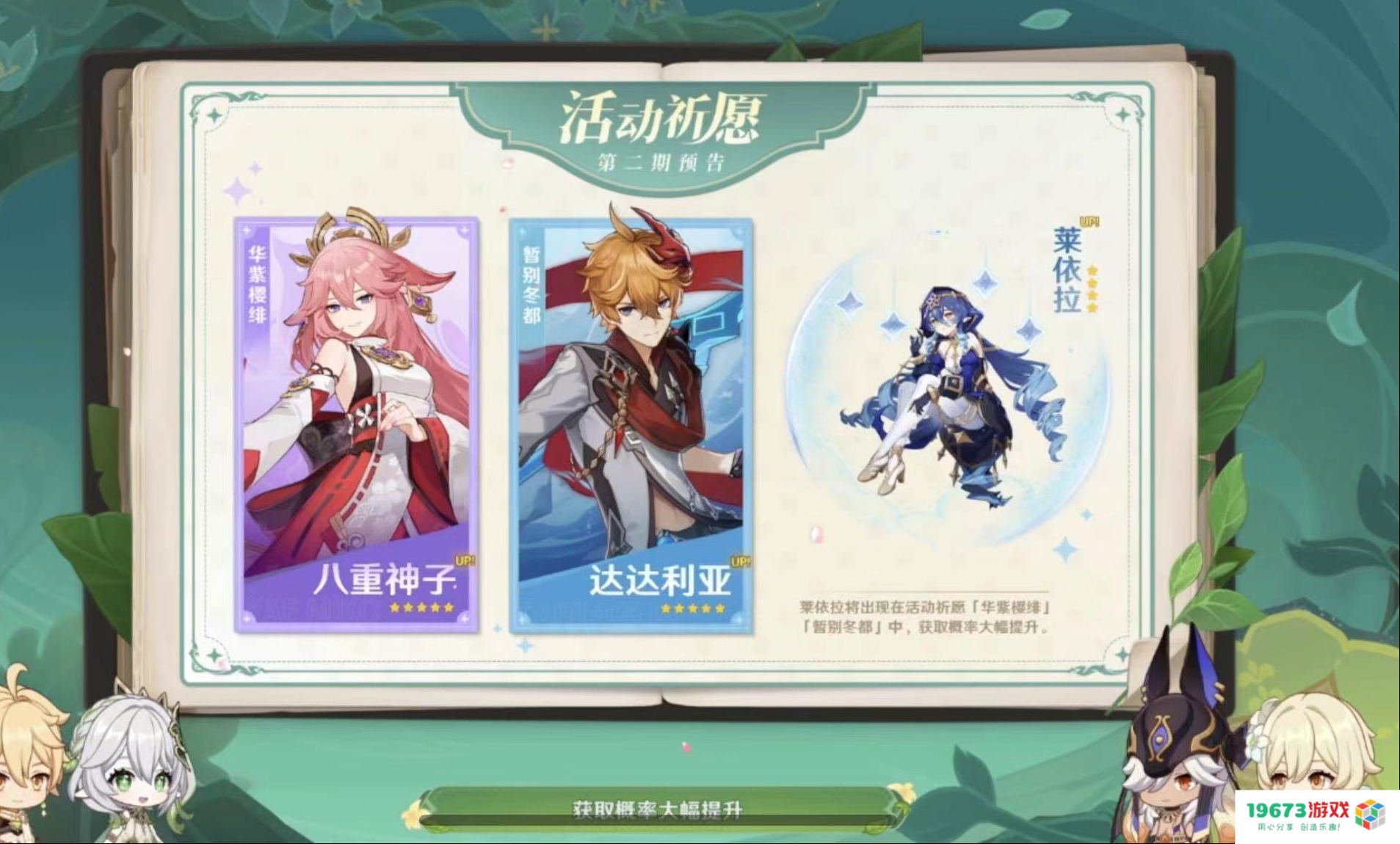 然后则是3.2卡池的安排情况。万众瞩目的草神纳西妲终于正式登场,并且带着她的专武和传说任务一同来到了旅行者的身边,宵宫也将在上半一同复刻。下半则是达达利亚、八重神子复刻,之前在稻妻与宵宫、神子还有喜欢公子的旅行者们可以放心冲了!同时,四星新角色冰系单手剑莱依拉将进入下半卡池。