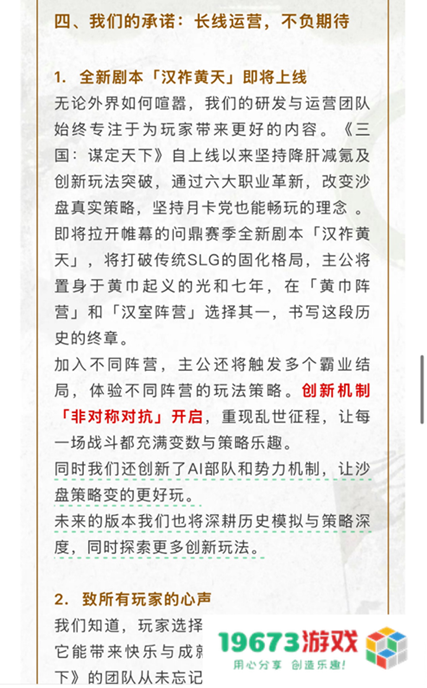 抛开争议,群众更关心游戏本身的创新。《三谋》自2024年上线以来,以“降肝减负”为核心推出的自动铺路、夜战保护、土地开发等机制,确实推动了SLG品类的体验优化。而《三战》在7月紧急跟进同类功能,也被玩家戏称为“四年没解决的痛点,被友商卷明白了”。这种“产品内卷”本是良性竞争的体现,但如今却被诉讼阴云遮蔽。值得期待的是,《三谋》即将推出的问鼎赛季剧本「汉祚黄天」,试图以“黄巾vs汉室”的非对称对抗、AI部队智能策略等设计打破传统SLG固化格局。群众更愿意看到厂商将资源投入此类创新,而非消耗在“互揭黑料”的舆论混战中。
